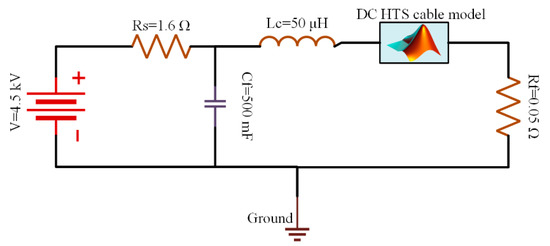 To analyze the behavior of understudied DC HTS cables, the test grid shown in Figure 4 was put to work. This figure represents the characteristics of fault current in the DC grid of a cryo-electric aircraft. The current waveform injected into the DC HTS cable by this grid is shown in Figure 5. As can be seen, after 10 ms, the current increases to charge the capacitor Cf and when it is discharged, the current gets back to its operational state.