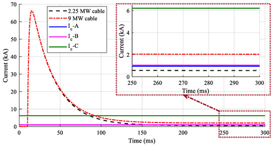 In this section, after selecting the optimum structure for the understudied DC HTS cables among the results offered by the Pareto front, the electrothermal characteristic of DC HTS cable is evaluated. For this purpose, Table 5 tabulates the selected design for DC HTS cable A with different former materials. It can be seen that the lightest cable is the one with aluminum former, which has 49% lower weight than one with copper former, 44% lower than one with stainless steel former, and 48% lower than cable with brass former. Meanwhile, cable with copper former has a temperature of 14%, 52%, and 54% lower than cable with aluminum, stainless steel, and brass formers, respectively. This shows that copper has the best thermal performance among all former materials, which is due to its lower resistivity, which generates a lower heat load, and also the acceptable heat capacity of copper. So, for further analyses, the cable with copper former is selected as the cable with the best performance against faults while the cable with aluminum former is selected as the lightest DC HTS cable A. Table 5 shares the information on the structure of the selected former for DC cable B resulting from NSGA II optimization. Although the former radius and thickness remained approximately similar to cable A, the weight of the optimized structure has been increased. This increase resulted from adding extra superconducting and dielectric layers to the cable. So, in the optimized structure of cable B, the weight of the cable with copper former has increased by 38% while its temperature has only been reduced by 4%. These changes are also valid for other former materials in cable B, compared to cable A. Finally, by changing the type of superconducting tape into one with a higher critical current, i.e., SC2, both the weight and size of DC cable, i.e., Cable C, have been reduced, as shown in Table 5.