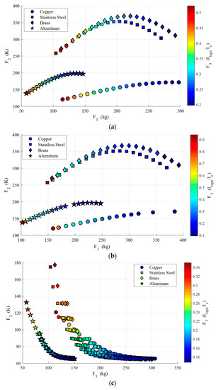 Figure 6a shows the Pareto front related to cable A with a 0.56 kA nominal current. According to this figure, the weight range of DC cable with copper former is from 110 kg to around 300 kg, the same as brass and stainless steel formers, which is due to the fact that they have a density value very similar to each other. On the other hand, DC cable with aluminum former has a range of 60 kg to 150 kg, which is a result of the low density of aluminum, around 2700 kg/m3. Thus, for cable A, aluminum is selected as the lightest former while copper has a better performance when one considers the peak temperature of the superconducting layer as the objective function. Also, if we consider the third objective function, it can be seen that F3 has values ranging from 0.2 to 0.5 that lie in an acceptable range. Figure 6b illustrates the Pareto front of multi-objective optimization for cable B. This cable consists of three superconducting layers, two dielectric layers, and one former layer. In order to have a sufficient number of SC1 tapes in one HTS layer for carrying 2000 A rated current, the former must have a radius of around 40 mm, which makes just the weight of the former around 220 kg. The weight of HTS tapes and dielectrics must be added to this value, which results in an extremely heavy HTS cable that could not fit into an electric aircraft. Thus, by adding the new layers to cable B, its weight range has increased in comparison to cable A, while the delivered power by cable B has also increased by 300%. The important factor here is the value of the third objective function that in some cases increased to 0.9, which could jeopardize the safe operation of DC HTS cable and cause hot spots and quench. Finally, Figure 6c shows the results of optimization on cable C, which has a 2000 A current, one superconducting layer, one dielectric layer, and one former. The number of superconducting and dielectric layers has been reduced by changing the superconducting tape to SC2. It should be noted that the presented values of weight are related to the summation of the weight of former, HTS tapes, and dielectrics.