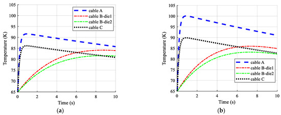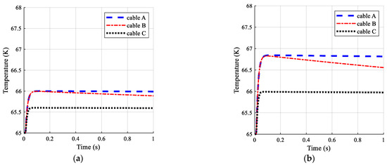 Finally, the temperature profile of dielectric layers is shown in Figure 9a,b for copper and aluminum former cables, respectively. The different temperature profile in dielectric layers of the second DC HTS cable is a result of a lower heat accumulation ratio in these layers, compared to cable A and cable C.