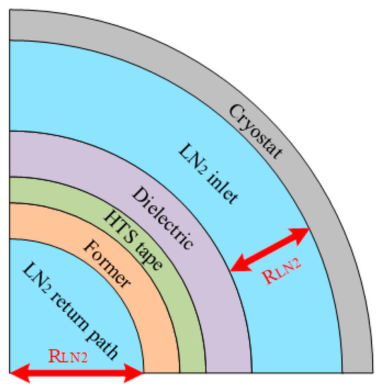 To calculate the specific mass and power density of the DC HTS cable, in addition to the weight of former, HTS tapes, and PPLP-based dielectrics, there is a need for adding the weight of cryostat and coolant fluid to the total weight of the cable. For weight calculation of the dielectrics, according to [26], a 2.5 mm thickness would be sufficient for power cables in a voltage range of 4–6 kV while the PPLP dielectric has a density of 1098 kg/m3 [27]. After that, a cryostat made out of stainless steel with a thickness of 1 mm and outer radius of 37 mm, for cables A and C, and 43 mm for cable B was considered. The difference between the cryostat inner radius and outer radius of the last layer of cable defines the total volume of coolant fluid, LN2, with 811 kg/m3 density [27]. This illustration is shown in Figure 10. By doing this, the total weight of DC HTS cables with respect to different former materials is calculated and tabulated in Table 6. After that, and by dividing the cable weight to the length of the cable (100 m), the specific mass could calculated. Then, the power of each cable in kW is divided to the weight of the cable to calculate the power density of cable. Based on [28], the specific mass for a HTS cable to be fitted into a cryo-electric aircraft system must be lower than 5 kg/m, which is the case for all types of understudied cables except cable B that has specific mass of 7.3 kg/m and 6.7 kg/m for copper and aluminum formers, respectively. On the other hand, the highest power density belongs to cable C with aluminum former, which is 12% higher than cable C with copper former. By comparing the cables with aluminum former, cable C has approximately 35% and around 310% higher power density in comparison to cable B and cable A, respectively. Moreover, cable B with aluminum former has 205% higher power density compared to cable A. In other words, HTS cables would have more benefits if they were used for high current, low voltage (lower deictic weight), and high-power applications, as can be observed in Table 6.