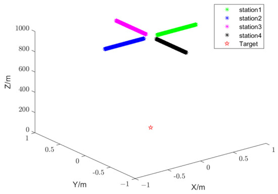 At first, the simulation of the CTLS positioning method was carried out. The target was located at coordinates (100, 100, 100), and four stations are moving at a constant speed and in a straight line at the altitude of 1000 m. The positioning error of the stations was 1 m, the azimuth error was 0.2°, and the pitch angle error was 0.1°. Their station-target trajectories are represented in Figure 3.
