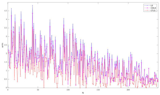 In Figure 4, the red plus line shows the resultant error of the CTLS algorithm, the purple star shows the final location error of the CWLS algorithm, and the blue dotted line represents the error calculated by the LS algorithm. A comparison of the three shows that the CTLS algorithm derived in this paper is effective in reducing the location error by approximately 10%, compared to the ordinary least squares algorithm, and by approximately 5%, compared to the CWLS algorithm.