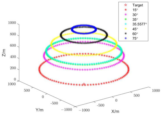 Figure 5 represents a schematic representation of the relative positions of the 100 UAVs to the target when the only difference is the pitch angle.