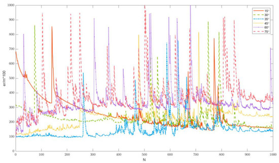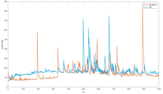 The different colors and large shaped lines in the Figure 6 represent a comparison of the positioning error at different pitch angles when the azimuth is the same. As we can see from the Figure 6 and Table 1, the smallest error can be achieved when the pitch angle is 35°. A separate comparison of the images found above for the particular angle of 35.5577°, with the angle of 35°, will be made in Figure 7.