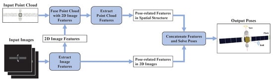 We show the overall idea of the proposed method in Figure 1. The method’s input includes the image of the pose target to be determined and the point cloud data. It should be mentioned that, unlike the image with depth information, the point cloud data and the input image do not correspond one-to-one; the point cloud corresponding to different images with different poses is unified. For the input image, Convolutional Neural Network (CNN) is used as a feature extractor to obtain pose-related features in the 2D image. For the point cloud data, our method first fuses the point cloud data with 2D image features, which are obtained from the image feature extraction results. Then, the point cloud features are extracted from the point cloud combined with the 2D image features, and the pose-related features in the spatial structure are obtained. Finally, the two features are concatenated together, and the pose is solved. To obtain more accurate pose results, this paper also designs a loss function for satellite pose estimation missions to further enhance the network’s pose estimation capability.