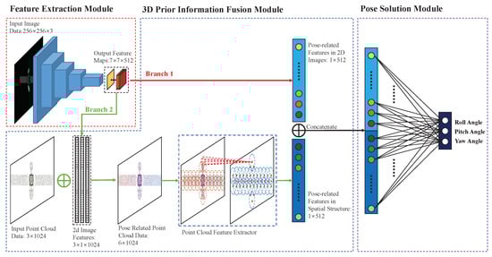 The overall structure of the proposed method is shown in Figure 2. The structure can be divided into three modules. The first module is the feature extraction module, utilizing CNN to obtain the feature map from the input image. The second module is the 3D prior information fusion module, which consists of two branches. One branch extracts the feature vectors corresponding to 2D images; the other branch extracts the feature vectors related to the spatial structure from the 3D model. Finally, the features extracted by the two branches are concatenated. The third module is the pose solution module, solving the pose from features outputted from the second module. In this section, we will describe each module in detail.