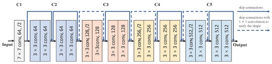 In this paper, we select the classic CNN structure ResNet [37] as the feature extractor. The structure of the feature extraction module is shown in Figure 3. The input image of ResNet is a three-channel image with the size of 224 × 224 × 3, but the images in our dataset have one channel with the size of 256 × 256 × 1. Therefore, we resize the original image to the target size via the interpolation method, and the gray image is copied into a three-channel image. Customizing the first convolution layer for a single-channel image is another alternative solution, but in order to retain the original network structure and to make the structure applicable to a three-channel image, we choose to change the channel of the input image. The output of the network is 7 × 7 × 512 feature maps.