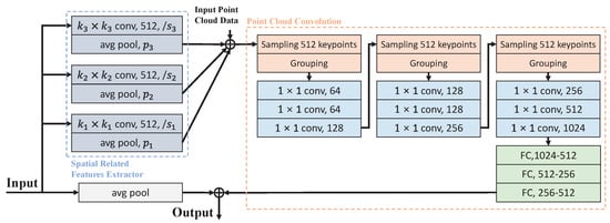 The 3D prior information fusion module contains two branches. One branch generates the pose-related features in 2D images with the size of 1 × 512 utilizing an average pooling layer, while the other branch generates the pose-related features in spatial structure with the size of 1 × 512 by the following steps. First, we extract features from the 2D image that correlate with the spatial structure. Then we fuse the features and 3D point cloud data by concatenating. Finally, we use the point cloud convolution method to receive the pose-related features of the spatial structure. After feature extraction, we concatenate these features together and form a 1024-d joint representation as the output of this module. The structure of the module is shown in Figure 4.