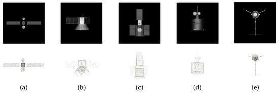 Simulated satellite images and corresponding point cloud. (a) A2100; (b) COBE; (c) EARLY-BIRD; (d) DSP; (e) GALILEO.