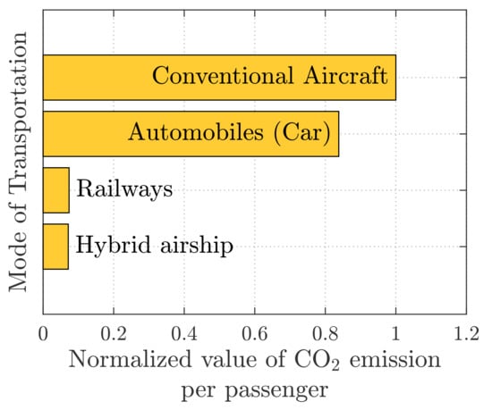 Green aviation is one of the hottest topics in today’s aeronautics research. Depleting fossil fuels and greenhouse gas (GHG) emissions are the two major concerns of air transportation. Every year, the increase in air traffic across the globe raises concerns about environmental pollution and global warming due to GHGs. Based on the current growing demand, it is estimated that passenger traffic will increase by 6% globally with 48% within the Asian region by the year 2035 [1]. The aviation sector substantially impacts global economic, social, and cultural development. It is a significant contributor to GHG emissions and is responsible for 2% of total fuel consumption by the transportation industry. Aviation’s contribution to the global emission of GHGs is estimated to be 13% of the total of different modes of transportation [2]. The drastic rise in air travel will result in enormous GHG emissions without a substantial reduction of fossil fuel burn. There is also a huge demand for civil transportation that is greener and more flexible than existing modes of transportation. As depicted in Figure 1 (based on a survey by the UK-based company HAV), airships and railways are relatively clean options compared to automobiles and airplanes. Compared to rail transportation, the ground infrastructure required for hybrid airship operation is minimal.