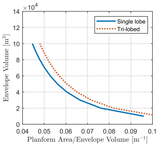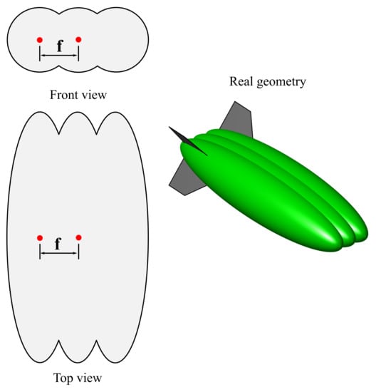 In recent years, airships, also known as lighter-than-air systems (LTA), have been considered to be a suitable platform for various applications such as heavy cargo transportation [42,43,44], high altitude long endurance (HALE) flight [45,46,47], surveillance and monitoring [48,49,50], and telecommunications [51]. Airships are categorized based on their internal structure and source of lift. Airships that can generate 20–40% aerodynamic lift are called hybrid airships [52,53]. Among hybrid airships, multi-lobed dynastats have various advantages for civil and defense applications [54,55,56,57]. Multi-lobed dynastats have a large surface-to-volume ratio compared to conventional ones (airships with an axis-symmetric body-of-revolution), as shown in Figure 2, which is a great advantage for the installation of photovoltaic (PV) cells over their surface [58]. In the present study, a lifting-body dynastat with a tri-lobed envelope is considered for applying a hybrid propulsion system.