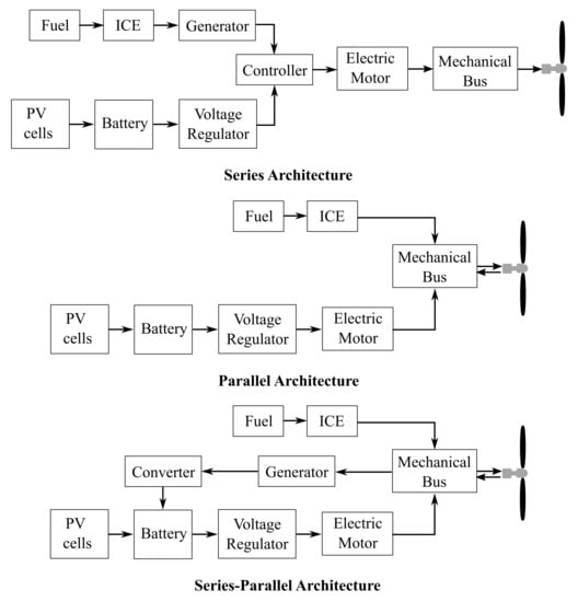 In hybrid-electric-powered vehicles, the propulsive energy required to overcome the drag is supplied by two or more energy sources: fuel, a rechargeable battery or fuel cell, and a solar array. There are three main architectures of the hybrid propulsion systems, as shown in Figure 3: series, parallel, and series–parallel [61,62,63].