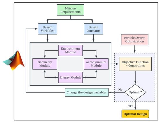 Airship sizing is a multi-disciplinary design process and involves various disciplines such as geometry, environment, structures, thermal, aerodynamics, stability and control, materials, etc. Figure 4 shows the disciplines involved in the sizing process and layout of the scheme followed for the optimization task in the present study. The geometry module includes a shape generation algorithm to define the shape of each lobe of the envelope and the elemental approach for solar array generation over the surface of the envelope. The aerodynamic module calculates the aerodynamic drag of the tri-lobed envelope and the aerodynamic lift at a given angle of attack. In this study, the angle of attack of the airship was fixed to be 3°. From an existing study [68] and the present study, it was observed that the change in drag coefficient is minimal between the range of angles of attack from zero to 3°. The volumetric drag coefficient of the hull was estimated by the semi-empirical relation shown in Equation (6), which is explained in detail in Section 2.2 and was proposed by Hoerner for an axisymmetric body of revolution at a zero-degree angle of incidence assuming the tri-lobed envelope as an equivalent ellipsoid.