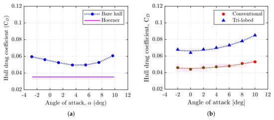 Bare hull drag coefficient versus angle of attack: (a) data taken from Carrión et al. [68]; (b) data obtained from CFD simulations.