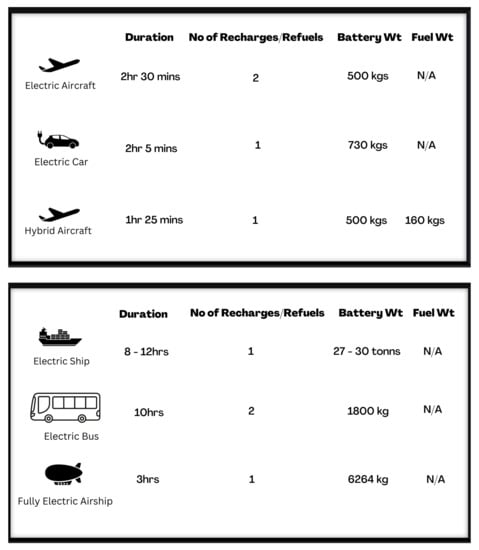 The infeasibility of commercial airplane hybridization is due to the substantial weight and volumetric penalty of the energy storage systems necessary to supply a large amount of power [39]. The overall efficiency of battery-powered aircraft is estimated to be 73%; this is estimated by combining the efficiency of each component of the system, including the battery (100%), controller (98%), electric motor (95%), gearbox (98%), and propeller (80%) [40]. However, there are many advantages to using conventional fuel for civil aircraft. Fuel is stored in the wings of aircraft for safety considerations, so it does not affect the payload volume. Fuel has a high volumetric energy density compared to all the alternative energy sources. The technological development of batteries, electric propulsion units, and accessories must be accelerated to be advanced enough for aeronautical applications. Based on current technological advancement, it is estimated that batteries with an energy density of 750 Wh/kg will not be available before the year 2035 [41]. Though aircraft have various advantages compared to airships, there is still a long way to achieve a 100% degree of hybridization.