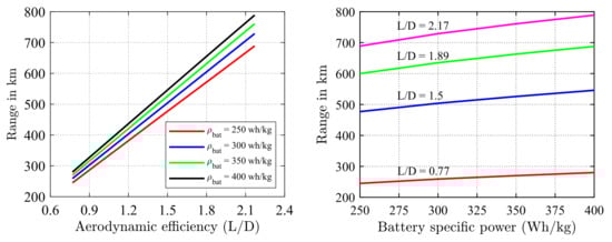 Effect of aerodynamic efficiency and battery specific power on range performance.