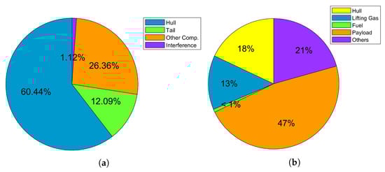 The multi-lobed airship configuration shown in Figure 9a is a variant powered by the hybrid propulsion technology using a fossil fuel along with the batteries, and Figure 9b represents the airship model powered by fuel and batteries in combination with the solar array. Figure 10a,b present the drag and mass distribution, respectively, of the baseline model powered by the conventional propulsion system. The hull of the airship is the major contributor to drag. With the help of aerodynamic-based shape optimization, the drag due to the complex shape of the envelope can be reduced, which in turn improves the degree of hybridization of the hybrid propulsion system.