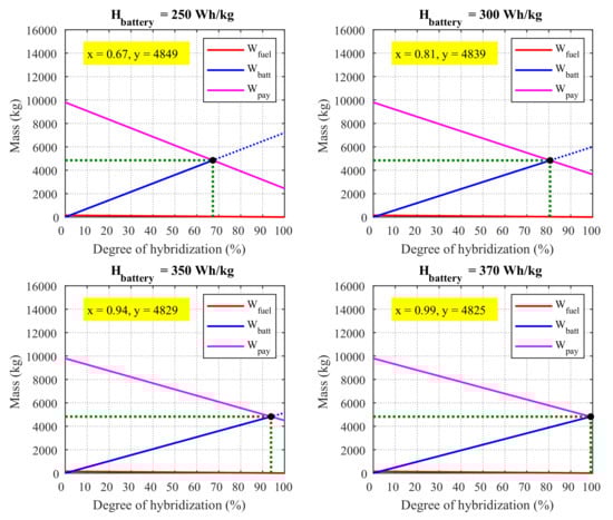 In all three case studies, the design range was fixed to be 500 km. The maximum degree of hybridization achievable with the baseline model for different specific energies of the battery is visualized in Figure 11. The battery mass increases significantly with an increase in the degree of hybridization, and fuel mass decreases. For a battery with a specific energy of 250 Wh/kg, a maximum of a 67% degree of hybridization can be achieved by a trade-off of 51% of the payload. The trend lines in Figure 11 show that a fully electric airship can be achieved by improving battery technology and battery specific energy. With battery technology with a specific energy of 370 Wh/kg, an airship can be converted to fully electric by a trade-off of nearly 51% of the payload. With further advancement in battery technology, the trade-off with the payload can be reduced significantly.