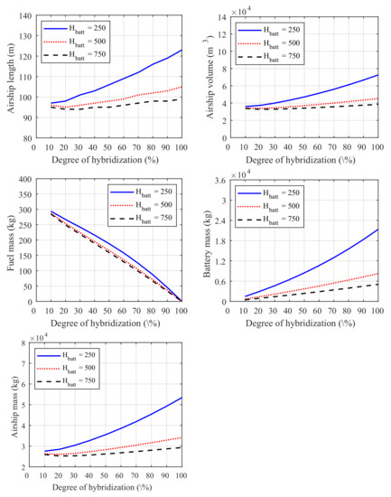 To investigate the effect of the hybrid propulsion system on the performance of the multi-lobed dynastat, a baseline model was designed using a conventional propulsion system powered by fossil fuel. The specific energy of the fuel was considered as 11.89 kWh/kg. The optimal outcome of the baseline model is given in Table 2. In order to understand the impact of the application of hybrid propulsion technology on the sizing and performance of the airships, the baseline model was employed with the hybrid propulsion system powered by fossil fuel, and the battery was implemented at various degrees of hybridization.