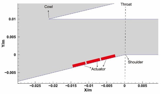 The configuration of a two-dimensional inlet model [21] is shown in Figure 1. The shoulder position on the lower wall was defined as the origin coordinate. Figure 2 shows the position of the NS-SDBD actuators, two of which were activated in each case. Table 1 shows the position of the actuators, the excitation frequency, the peak voltage as well as the input energy of each actuator. Different peak voltages were applied in order to ensure the same input energy in Cases 1–3. The voltage rising time and pulse duration were identical in all cases, which were tr = 7 ns and td = 50 ns, respectively.