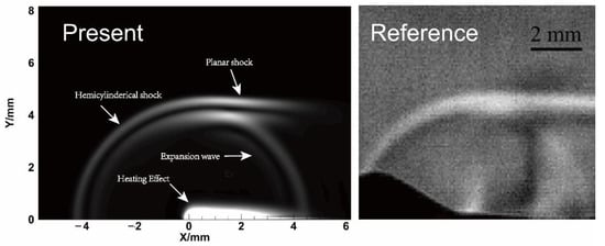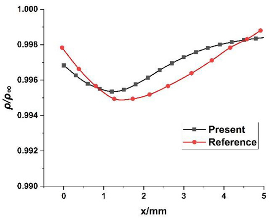 Figure 4 compares the density gradient distribution at 14 μs after the discharge. The flow structures contained a forward hemicylindrical shock wave, an upward planar shock wave, and a backward expansion wave. The gas heating effect of the plasma induced a variation of density in the near-wall zone. The positions of compression waves and expansion wave acquired by the phenomenological method fitted well with the experimental image, which illustrates that the wave propagation speed was accurately simulated. Figure 5 shows the density distribution in the near-wall zone at 0.3 ms. The maximum error of the numerical method was approximately 0.1% due to the neglection of the real gas effect. The nanosecond discharge changed the components of air near the electrode, resulting in the variation of local gas properties. However, this effect was relatively weak through the comparison of the numerical and experimental data, indicating the feasibility of using the ideal gas law in phenomenological simulation.