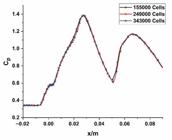 The hypersonic inlet flow was calculated using three sets of grids. Figure 6 shows the pressure coefficient of the internal compression section and the forepart of the isolator. It is shown that the result provided by the medium grid almost coincided with that of the fine grid. In order to save computing resources, the medium cell number was set in all cases. The total cell number was 249,000.