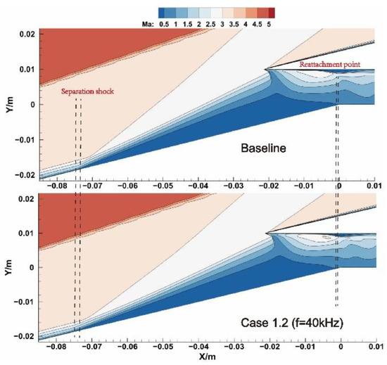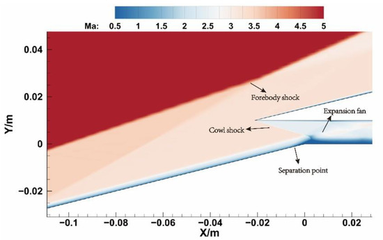The baseline flow field in the starting state (inflow condition Ma∞ = 5, AOA = 5°) is shown in Figure 7. The incident cowl shock interacted with the boundary layer, forming a separation bubble and expansion fan. Since the forebody shock was away from the cowl, the inlet was in off-design state. This steady-state baseline flow was adopted as the initial value of the NS-SDBD flow control simulation.