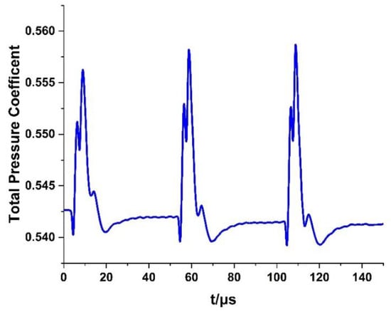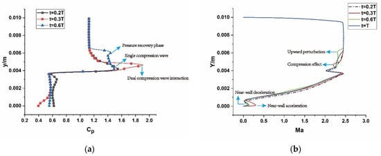 The influence of actuator parameters on the total pressure recovery coefficient at the throat section was studied by changing the frequency and actuator position, which is shown in Figure 11. With the rise in the discharge frequency, the ratio of disturbance duration to flow time increased, indicating a more continuous control effect. Under the condition of discharge frequency f = 80 kHz, the time averaged total pressure increased by 0.65%, and the peak total pressure increased by 2.37% compared with baseline flow. Providing there was the same energy input, the initial total pressure changed with the discharge frequency because of the desynchrony between discharge period and flow recovery time, which can be further explained by analyzing the variation of pressure and Mach number in a single excitation period, as illustrated in Figure 12. In Case 1.2, the first compression wave generated by the downstream actuator reached the throat section at t = 0.2 T and interacted with the second compression wave at t = 0.3 T, creating a pressure increase as well as Mach number reduction in the middle part of the section. The plasma region induced a high-pressure zone and a low-pressure zone which moved downstream along the wall, reducing the flow speed at t = 0.2 T while starting to accelerate it at t = 0.3 T. From t = 0.3 T to t = 0.6 T, the static pressure started to recover at the center part, while the low Mach number zone propagated upward. At the moment of the next discharge, the local Mach number had not recovered to the baseline state; therefore, the initial and peak total pressure depended on the relative strength of the Mach number reduction effect and pressure recovery effect. In Case 1.3, the proportion of pressure recovery time was smaller than the other cases, and the low Mach number zone had relatively less time to propagate, resulting in a higher initial total pressure. The peak value of total pressure in Case 1.3 was lower than that in Case 1.1 and Case 1.2 due to the remaining effect of near-wall Mach number reduction at the arrival time of the compression wave. Compared with Case 1.2, the actuators in Case 2 (with the same frequency) were farther apart, and the compression perturbations generated by the two actuators did not intersect at the throat section, resulting in no additional pressure jump; hence, the peak total pressure was relatively low.