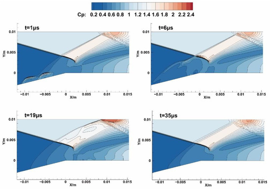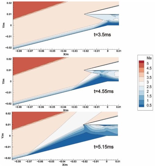 The converged steady flow field in starting state (Ma∞ = 5, AOA = 5°) was used as the initial flow field, while the attack angle was increased to 6° in order to simulate the unstart process. As shown in Figure 14, the separation bubble generated by the adverse pressure gradient gradually moved forward from the shoulder point. At 5.15 ms, after the change of attack angle, the highest point of the separation bubble reached the cowl section, forming a normal shock wave, which led to a significant decrease in the mass flow rate coefficient and total pressure recovery coefficient. At this moment, the actuator was turned on for flow control.