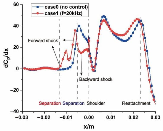 Figure 10 shows the pressure coefficient gradient distribution on the lower wall of the inlet. Compared with the uncontrolled condition, the forward compression wave caused the rise in the local adverse pressure gradient, whereas the backward compression wave reduced the adverse pressure gradient of the separation zone before the shoulder point. Therefore, the discharge moved the separation point forward and reduced the strength of separation shock.