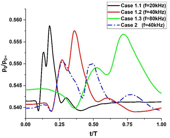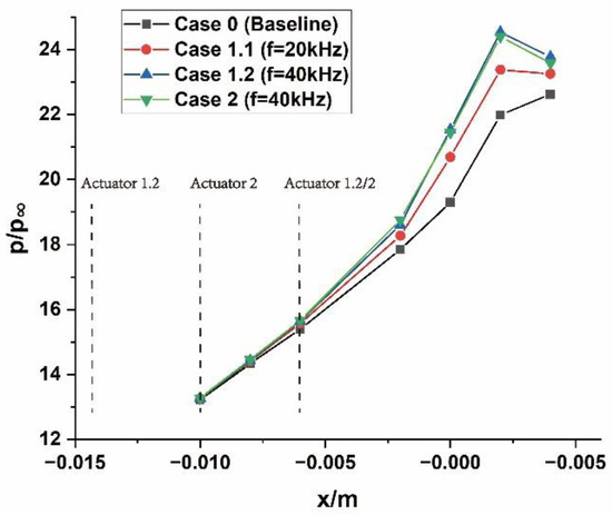 Figure 13 compares the time averaged pressure ratio at different cross-section positions. With the rise in discharge frequency, the pressure perturbation time ratio increased. In Case 1.2, the maximum pressure ratio increased by 11.6% compared with that in the baseline flow field. The pressure-boost effect became stronger as the compression wave spread downstream, and the maximum increment happened at x = 2 mm. The dual compression wave interaction makes the pressure ratio in Case 1.2 slightly higher than that in Case 2.