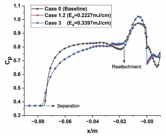 Figure 15 compares the inlet flow field at 50 μs (f = 40 kHz) after the discharge with that in the uncontrolled state. The compression wave generated by the actuator raised the pressure in the reattachment zone, pushing the reattachment point forward, meanwhile decreasing the height of the separation bubble and extending its length. The separation shock angle was decreased from 7.9° to 7.1° with the forward movement of separation shock. Furthermore, the strength of the normal cowl shock was reduced, and the mass flow rate of inlet was recovered by 11.67% at the throat section compared with that at the moment of the first excitation. It can be seen from Figure 16 that the separation point was pushed forward slightly while the intensity of the separation shock was reduced under the condition of nanosecond discharge. With the increase in input energy, the compression wave became stronger, leading to a higher pressure rise in front of the reattachment zone. The total pressure coefficient at the cowl section was increased by 0.68% under the condition of 52.5% input energy increment.