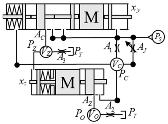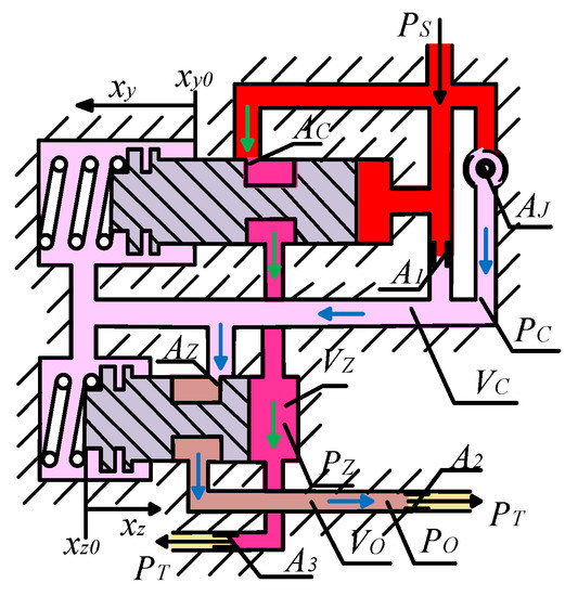 Where is the inlet pressure, is the controlled pressure, is the regulating pressure, is the ejection pressure, is the return pressure, is the variable inlet flow area, is the variable compensated flow area, is the variable regulating flow area, is the fixed inlet flow area, is the fixed ejection flow area, is the fixed outlet flow area, is the volume of the controlled chamber, is the volume of the regulating chamber, is the volume of the ejection chamber, is the displacement of the compensated motion valve, and is the displacement of the regulating motion valve.