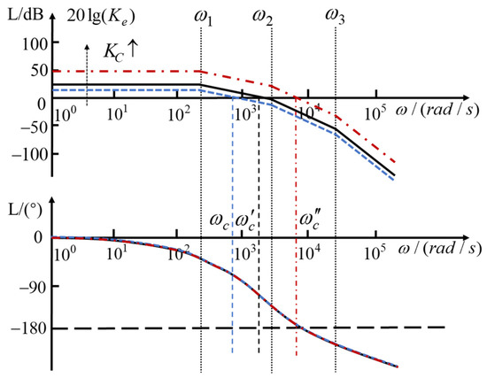 Assuming and only changing , by calculating the magnitude of the parameters , , , , , and , the bode diagram curves are shown in Figure 5.