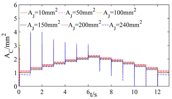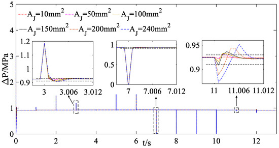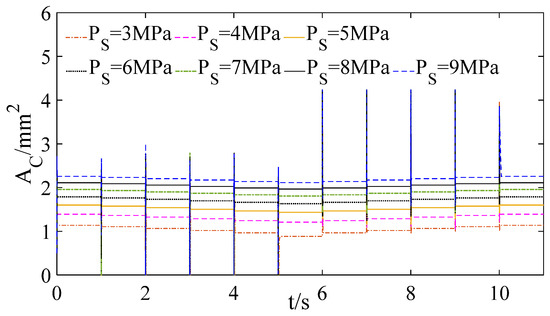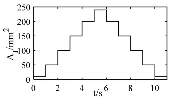 - Within the working range of the inputs, set the variable inlet flow area input as 10 mm2, 50 mm2, 100 mm2, 150 mm2, 200 mm2, and 240 mm2, respectively, and give the inlet pressure step input signal as shown in Figure 10. The simulation results are shown in Figure 11.
