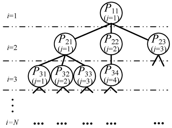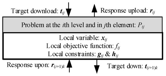 As mentioned above, ATC is a promising approach to solving complex hierarchical MDO problems [18]. Figure 2 provides the organization of an ATC problem containing N levels, where Pij is the problem of the jth element at the ith level. Each element contains its own target and passes the value of the optimal solution up and down. Therefore, an inner optimization occurs in every single element. Equation (1) shows the set of all ATC variables of the current element; x is the local input variable, t is the target, r is the response, f is the local objective function, π is the relaxation function, Cij is the collection of inferior elements decomposed and based on the current element, g is the local inequality constraint, h is the local equality constraint, xmin and xmax are the minimum value and maximum value of x, respectively, and ε is the number of elements in the same level. A hierarchical organization with elements is created as one outer loop for calculation. The consistency requirements of linking variables are satisfied after several cycles. Thus, the ATC method achieves a final optimal solution of the problem. Figure 3 provides the information communication of one element.