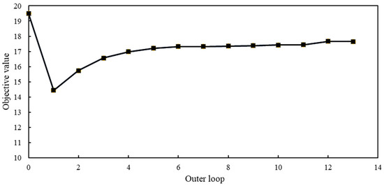 Figure 5 shows the convergence iterations of the ATC cycle with MIGA. Fourteen cycles proceed with ATC decomposition, which increases the calculation burden of global optimization. However, the application of the ATC method can realize parallel calculation of elements at a lower level at the same time. Each element has a smaller analysis scale (one formula at the child level and two formulas at the parent level) than the entire MDF analysis scale (four formulas). Thus, the model with a smaller scale enables the optimization of each element (at each level) to be simpler in ATC elements than that in MDF, which means that the calculation burden from ATC decomposition may be solved through the small element scale and the parallel calculation. This implies that when the system hierarchy and discipline structure become more complex, ATC is a possible method to solve the multi-level MDO problem and MIGA is an effective and precision-acceptable algorithm for both MDF and ATC methods.