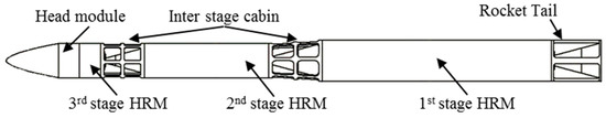 The baseline configuration of the LV is shown in Figure 6. Three HRMs make up the main structure of the LV. Apart from them, the mass and dimension of the other components, including payload adapters, electronic avionics device and attitude control equipment, inter-stages and tail cabin, are set as constant values based on engineering experience.