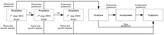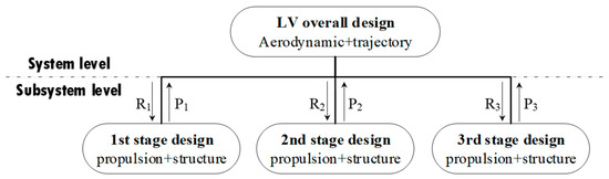 Three stages of HRMs constitute the LV’s main body structure. Different from the strong coupling between each body structure in the design of a single-stage aircraft or an automotive vehicle, LV joins each motor stage with inter-stage sections, which have loose restrictions in size and other coupled parameters. In particular, all motor stages have the same design logic when the propulsion systems are of the same type. Accordingly, in the practical design process, with the technical requirements given by the overall design results, the three stages will be designed and then their performances will be returned to overall design as feedback, as shown in Figure 7, where Ri means the requirement with regard to the subsystem, and Pi is the performance of the subsystem. Therefore, the LV design shows obvious multi-level characteristics, in which the overall design is a system level process while the motor stage designs are subsystem level processes.