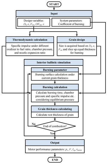 The propulsion model for the HRM design includes three main modules: the grain design, the preliminary design of the thrust chamber and the interior ballistic simulation according to Ref. [12]. Figure 8 shows the general process of HRM design. Through the propulsion model, the average chamber pressure pc, the average specific impulse Isp, the average thrust F, the motor operating time tmotor and the other propulsion performance parameters are computed from the initial design parameters, including initial thrust Fini, initial oxidizer to fuel ratio OFini, nozzle expansion ratio ε and initial grain shape parameters, such as the diameter of the grain Df and the thickness of the grain e.