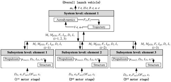 The overall design of an LV is a complex problem and contains several physical disciplines, including propulsion, structure, aerodynamics and trajectory [13]. Therefore, multi-disciplinary design optimization (MDO) is always applied to fully consider interdisciplinary interactions [14]. MDO methods were firstly proposed in the area of structural optimization more than 30 years ago. The multiple discipline feasible (MDF) method, as a basic MDO method which is widely used in the area of industrial application, considers the model as a “design black box”. Obviously, the MDF process has the advantages of intuitiveness and comprehensibility. However, when it comes to engineering problems with a complex coupling relationship, the application of the MDF method results in huge computational complexity. Thus, multi-level MDO methods are proposed in order to realize subspace decoupling and parallel optimization [14].