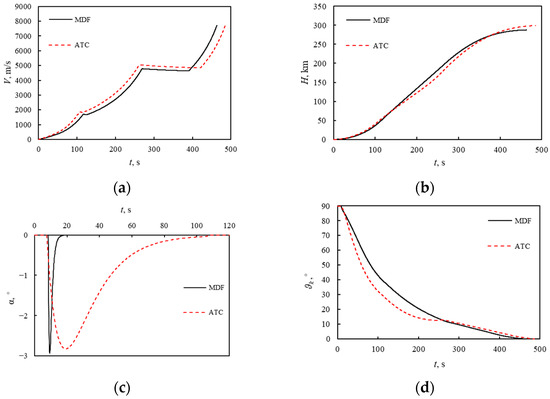 According to Figure 14c, ATC design processes a smoother turn in the program turn phase. Compared with the MDF method, the ATC method gives a longer turning time while the maximum angle of attack is similar, which leads to a rapid decline in tilt angle at the first stage flight, as Figure 14d shows. Thus, at the end of the first stage flight, the tilt angle of the ATC method is reduced to about 30°, while that of the MDF method is about 38°. At the same time, the angular rate of pitch angle at the second stage given by ATC method (0.04335°/s) is significantly smaller than that given by the MDF method (0.21604°/s), which slows down the downward trend of tilt angle. The tilt angle of the ATC method (12.8°) is similar to that of the MDF method (11.7°) when the second HRM shuts down. This difference in flight strategy leads to altitude of the ATC method being lower in the middle of the flight, which is consistent with the result presented in Figure 14b. ϑk-t curves in Figure 14d also indicate that both designs process a good performance for the smooth injection, based on a similar third HRM design.