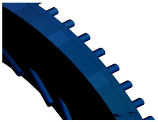 The 3D CFD model used for the calculation is divided into two computational domains: a stationary one and a rotational one. The two domains are connected by an interface, which is parallel to the disk (as shown in Figure 2). The medium is a compressible ideal gas and is calculated using the commercial software CFX19 with a physical time step of 2.5 × 10−5 and a convergence criterion of RSM < 10−5. There are two steady-state methods for handling interfaces in CFX, namely Stage and Frozen Rotor [24]. What we study in this paper is an asymmetric boundary condition, and the Frozen Rotor method is more appropriate. The boundary conditions for the calculation are shown in Table 3: the outlet_0 corresponds to the broken blade, so its outlet pressure is lower than that of the other receiver holes. In this paper, the boundary conditions of the pre-swirl system after turbine blade fracture are simulated by the different pressure of the receiver holes. When the outlet pressures of all receiver holes are equal, it means that the turbine blades are not fractured.