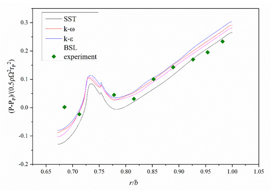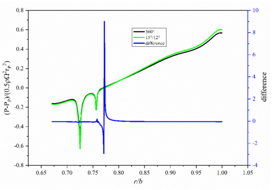 As mentioned above, the turbulence model and mesh validation in this section were performed with the sector model (shown in Figure 4), while the full-loop model (shown in Figure 2) is used in the next section. So, it is necessary to confirm that the validated turbulence model and mesh setup parameters are also appropriate in the full-loop model. To verify the consistency of computation between the 360° domain and the 15°/12° domain, it is necessary to prove that the difference between the two kinds of domain is little. Figure 7 shows the distribution of the dimensionless static pressure near the stator along the radial direction calculated by the two models, which indicates that the deviation between the two domains is below 5% in most areas except the areas where the pressure is equal to that of the nozzles. Therefore, the validation of the turbulence model and mesh setting verified by the 15°/12° domain is also applicable to the 360° domain.