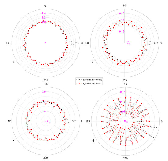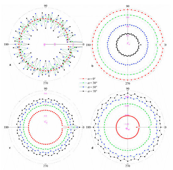 The distributions of η, Cp, Cd, and Θad in the circumferential direction are shown in Figure 8, respectively, for different α. These curves all consist of 60 data points, each corresponding to a receiver hole. Hole_0, corresponding to the fractured blade, is located at 0° of the polar coordinate system, and hole_1 is located at 6°. The θ increases in the same direction as the rotation of the rotor (thus, hole_1 is located downstream of hole_0, whereas hole_59 is located upstream of it). This is also the same for the curves below and will not be repeated.