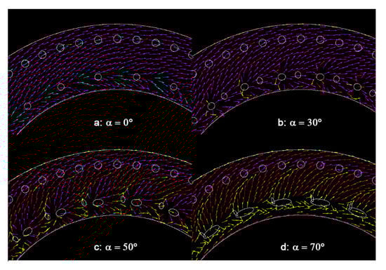The distribution of mass flow is critical to the cooling of blades; so first, look at the distribution of η. Figure 8a shows the distribution of η for each receiver hole except hole_0. From the figure, it can be seen that the receiver holes around hole_0 are affected more by the fractured blade, while it has little influence on those holes far from hole_0. In addition, it is obvious from the figure that the amplitude of fluctuations gradually increases with the increase in α and shows a periodic character. It is important to note that the fluctuations in η are not due to the asymmetry of the boundary (blade fractured). As shown in Figure 9, even though the boundary conditions are symmetric (blade not fractured), the η of holes are still not equal. This indicates that the turbine blade fracture does not affect the area away from the fractured blade. This is supposed to be attributed to the method of Frozen Rotor and the reasons that will be described below. When α = 0°, the air is ejected from the nozzle and impacts the rotor vertically, and flows towards the high-radius region driven by the rotor. By the high-radius position, the flow tends to be uniform (as shown in Figure 10a, the vector is uniform near the receiver holes), and therefore η changes more smoothly. As α increases, the effect of the rotor on the air is reduced, resulting in the uneven flow caused by the discrete nozzles affecting the flow near the receiver hole (as shown in Figure 10a, the vector near the receiver holes is influenced by the nozzles). This is ultimately reflected in the fluctuations of η, so the period of the fluctuation is closely related to the number of nozzles.