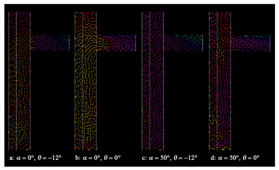 Vector at the plane z = 0.5 for different pre-swirl angles: (a) α = 0°, (b) α = 30°, (c) α = 50°, (d) α = 70°.