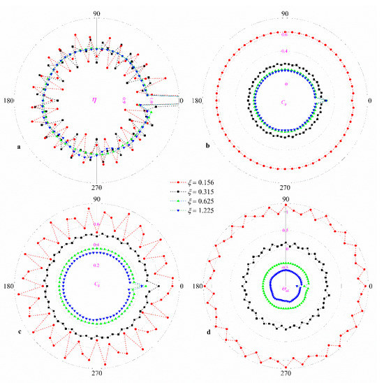 Figure 12a shows the distribution of η for each receiver hole (except hole_0) with different ξ. From the figure, it can be seen that as ξ increases from 0.156 to 0.625, the fluctuation amplitude of η gradually decreases or even disappears, and of course, the fluctuation shows a periodic pattern related to the nozzles. Continuing to increase ξ to 1.225, the η again shows some fluctuations, but mainly in the upstream of hole_0. When ξ is small, the βp is larger, and thus the fluence of discrete nozzles is greater. Therefore, the distribution of η shows a clear periodic fluctuation closely related to the number of nozzles, and the fluctuation decreases as ξ increases. The unevenness caused by the nozzles diminishes, so the distribution tends to level off when ξ increases. Continuing to increase ξ to 1.225, the effect of the receiver holes becomes apparent, and the fluctuations in η in the upstream are due to fluctuations in Cd (shown in Figure 12c) and Coriolis force [18]. As for hole_0, ηhole_0 is 1.711, 1.536, 1.532, and 1.543, when ξ is 0.156, 0.315, 0.625, and 1.225, respectively. Therefore, the effect of ξ on ηhole_0 is minor considering the fluctuations.