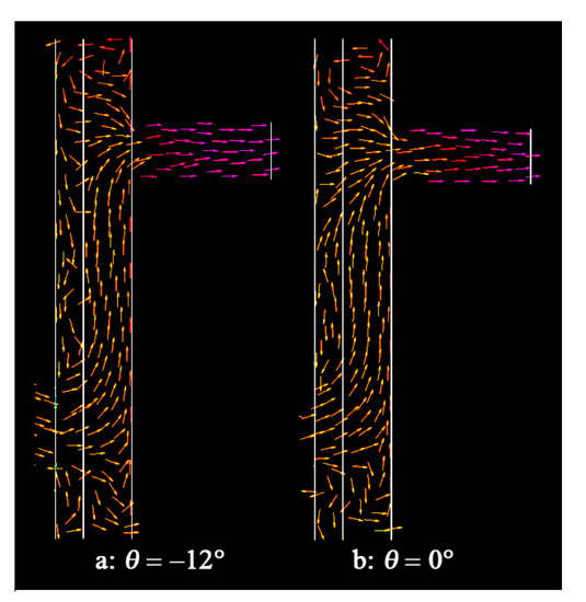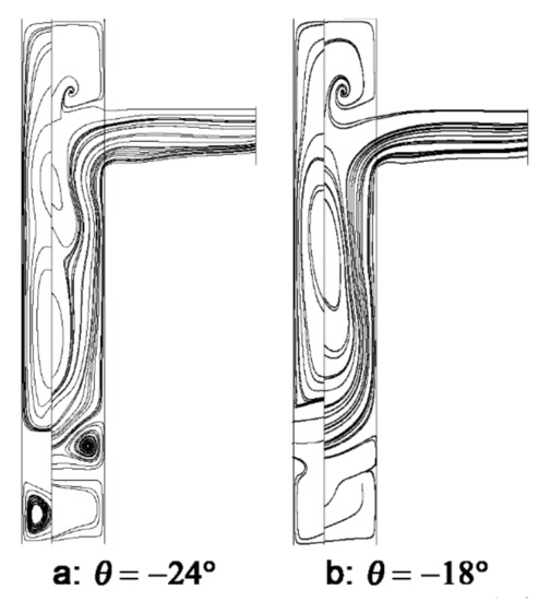 Figure 15a shows the distribution of η for each receiver hole (except hole_0) with different G. From the figure, it can be seen that the distribution of η shows a periodic pattern except for hole_0. Especially when G = 0.0509, the fluctuation amplitude is the largest. When G is small or larger, there are two vortexes in low and high radius, and the flow structures are relatively stable (shown in Figure 16a,d, whose flow structures are not changed with θ). Only when G is of moderate size (e.g., G = 0.0509) does the transition area of the two vortexes becomes unstable, and the relative position of the nozzle to the hole can affect its flow structure. For example, for G = 0.0509, the flow structures at the three tangential positions of θ = −24° (shown in Figure 17a), θ = −18° (shown in Figure 17b), and θ = −12° (shown in Figure 16c) are not the same, which shows the instability of the flow structure. This results in large fluctuations in η. As for hole_0, ηhole_0 is 1.545, 1.563, 1.536, and 1.556, when G is 0.0231, 0.0370, 0.0509, and 0.0648, respectively. The effect of G on ηhole_0 is almost negligible.